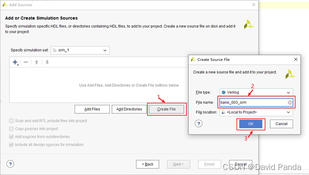 ②点击“Create File”,在弹出的对话框中给仿真源文件命名(命名规则与设计源文件一致),点击“OK”继续。