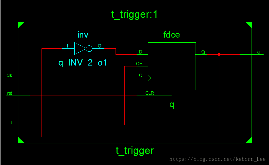 这个电路比较有意思了,不复杂,由于是在FPGA中综合出来的电路,所以这个T触发器同样是由D触发器组成的,CE为使能端,CE与t相连,当t(CE)为1时,D触发器工作,由于D触发器的输出q经过一个反相器后与输入d相连,所以此时,输出q为q的前一个状态的翻转,即。