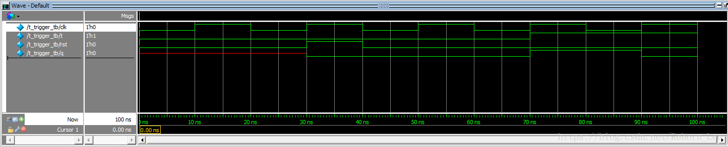 从波形可以看出,前30ns的输出值不确定,这也在预料之内,由于此刻没有复位,所以输出值处于未知,所以直到复位前都将是不确定状态。后面也可以看出,T触发器的作用就是,时钟上升沿触发时刻,t 为0 时,输出保持,t为1时,输出翻转。