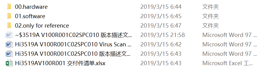 2)Hi3519A V100R001C02SPC010 它的子目录01.softwareboard下面有3519Av100的软件开发工具包Hi3519AV100_SDK_V2.0.1.0.tgz, 非常重要。 此外01.softwarepc子目录下一些如uboot烧写,tune PQ之类的工具。