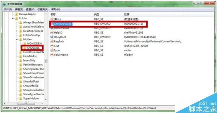 2、在“注册表管理器”窗口,按照HKEY-LOCAL-MACHINE\SOFTWARE\MICROSOFT\WINDOWS\CurrentVersion\EXPLORER\aDVANCEN\fOLDER\hIDDEN\SHOWALL的路径,点击“SHOWALL”在其右侧窗口中找到“checkedValue”。