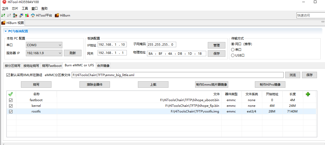 在给的资料里面有Hitool这款工具,这款工具可以进行u-boot烧写,工具的配置也是采用串口,此时需要退出Xshell的串口连接,因为串口冲突。连接后如图可选,只进行u-boot的烧写的话只需要串口就可以进行烧写。此时选取emmc烧写。xxx.xml是分区表文件,我直接加载分区表然后稍微修改名字如下,此处只能烧入uboot,不能烧入内核和系统,后续使用TFTP烧入内核和系统。