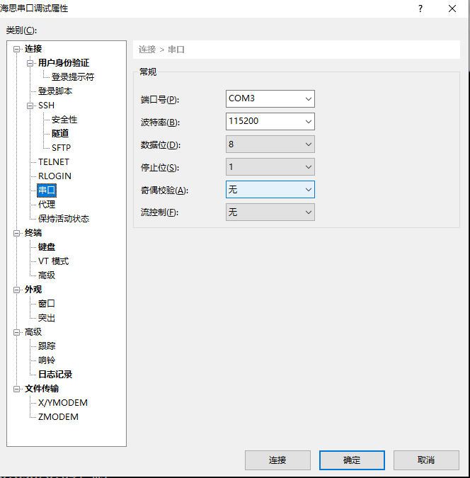 2. 按照板卡说明,插入电脑调整波特率 默认115200,其它的默认(特殊情况的会修改),我采用的是下图设置(COM号根据插拔串口进入设备管理里面找到出现和消失的COM,驱动设备名称视芯片名字而定)
