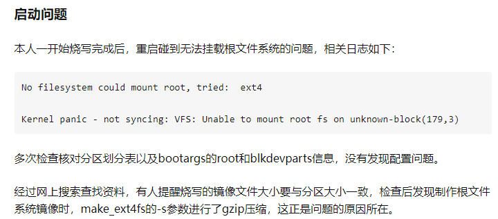 3. 进入系统后后面的事情原本我以为很顺利的但是“世间多歧路” 系统启动不了,重启复位多次,系统还是启动不了问题如下图所示:下图这种情况我全网搜(我感觉已经尽力了)只找到知乎的一位文章非常笼统的提到过,放下链接与图片海思3519芯片的姑且一看,有一篇具有参考性。但是系统的编译这可能是以后要用到的,我暂时不去深究,只想启动开发板。