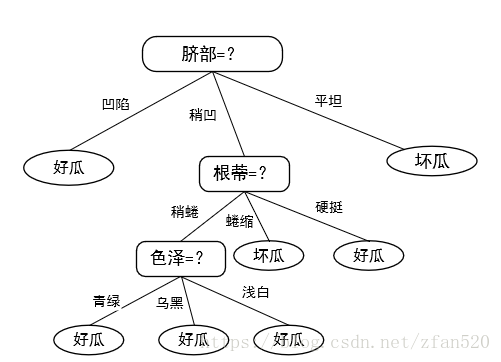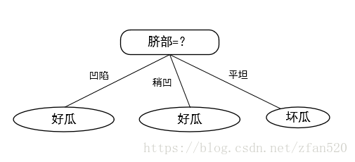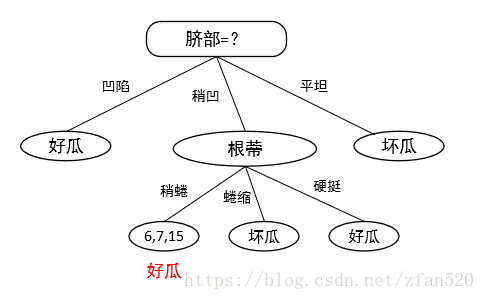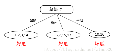 (2)计算训练集的信息增益,得知脐部的信息增益最大,因此按照脐部进行划分。又因为在训练集中,凹陷特征好瓜的占比多,因此凹陷划分为好瓜,稍凹特征好过占比多,因此将其标记为好瓜,因此按照脐部划分的子树结果如下: