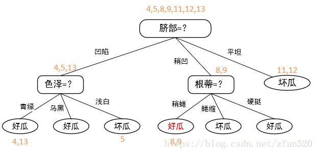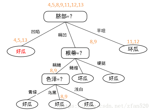 (4)接下来,我们看脐部凹陷分支。由于在训练集上,将色泽替换为叶节点后,包含的样本号为{1,2,3,14},好瓜(3个)多于坏瓜(1个),因此选择好瓜进行标记,剪枝后的决策树为: