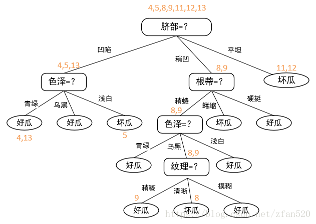 | 编号 | 好瓜(正确结果) | 按照脐部划分 | 对凹陷,按照色泽划分 |