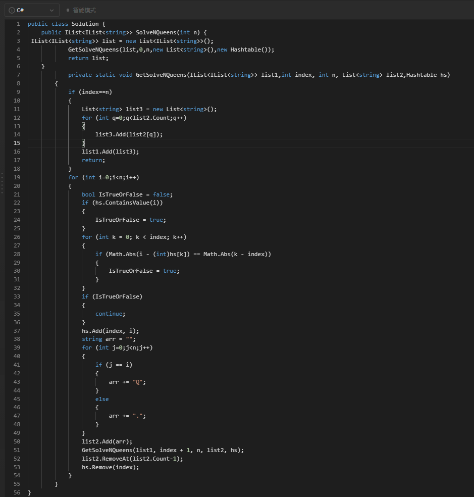 解题思路:穷举出每一行皇后可能放置的位置并且记录下来,当第一行元素选择了皇后放置的位置比如第一行第二列,则记录下来它的位置,后期选择下面行皇后放置的位置的时候应该避免在其主副对角线以及行列上选择,在这里我们可以用hashtable来记录每一行的皇后放置的行列坐标位置,这里有一点特别值得深究,就是如何判断是否在上面行所放置皇后的主副对角线上?前面我们已经提到了用hashtable(哈希表)来存储每一行皇后所放置的坐标,例如key存储皇后所放位置的行坐标value则用来存储列坐标,所以我们可以很简单的判断选择当前行应放置皇后的位置,只需判断当前所放位置的行列坐标是否已经在hashtable(哈希表)中就可以了,如果hashtable存在这个行坐标或者列坐标则代表当前行所选择的皇后所放位置出现在了之前行所选择的皇后所放位置的行或者列上则当前这个位置不能放皇后,如果当前行所选择的放置皇后的位置与hash表中之前行皇后放置的位置的行列坐标相减的绝对值相等的话(行列坐标依次相减)则说明当前行所要选择放置皇后的位置存在在之前行放置皇后位置的主副对角线之上所以不行.当当前行无法选择放置的皇后位置的时候则跳到上一行调整接下来可以放置皇后的位置,再进行递归。结合上面提到的回溯思考的三个问题:路径.选择列表.结束条件。我们就都有了.用哈希表来存储路径也就是存当前行之前行所选择的皇后放置的位置,然后再用哈希表来对当前行所要放置皇后位置做出选择,所以选择列表也有了,最后结束条件就是递归遍历完所有行可以放置皇后位置的所有可能.