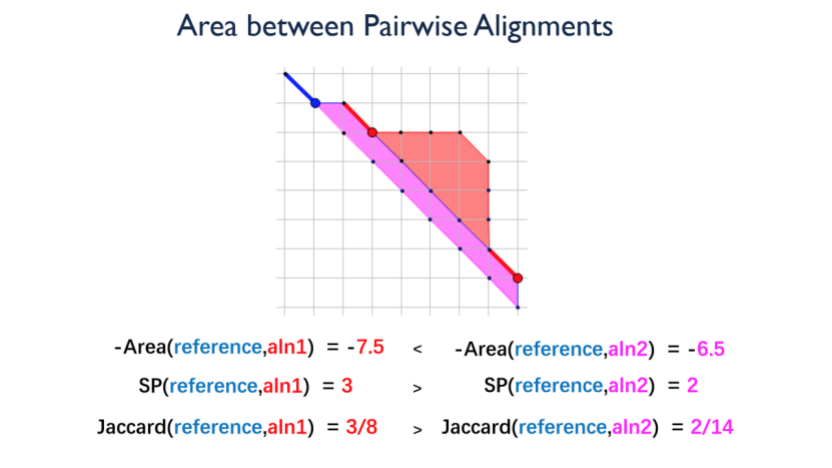 但原有方法不能捕捉这一信息,所以需要一种新的损失函数能够体现联配之间的几何差异。教授们想到一种精妙的方法,将现有的联配与真实的联配的距离用两种联配对应表格中路径围成的面积来度量,以面积最小为目标来训练神经网络。马剑竹教授的这项工作“PALM: Probabilistic Area Loss Minimization for Protein Sequence Alignment”发表在UAI上。