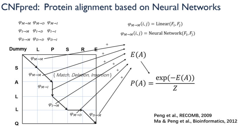 做两个蛋白质的联配可以用动态规划算法,填写动态规划表格,再回溯找到表格中的通路,也就是联配方式。但难点在于不知道某一个字母应当对应哪个字母,因此需要用监督学习为联配结果赋分。于是可以将已知结构的蛋白做堆叠,得到真实的联配方式,然后以最大似然作为优化目标,即让真实联配方式的分值最大化为目标来训练神经网络。这是一种基于格子的条件随机场方法(grid conditional random field),其中配分函数(Partition function)刚好能在多项式时间算出,因此可以对数似然函数做梯度下降。该论文“A conditional neural fields model for protein threading”发表在Bioinformatics上。