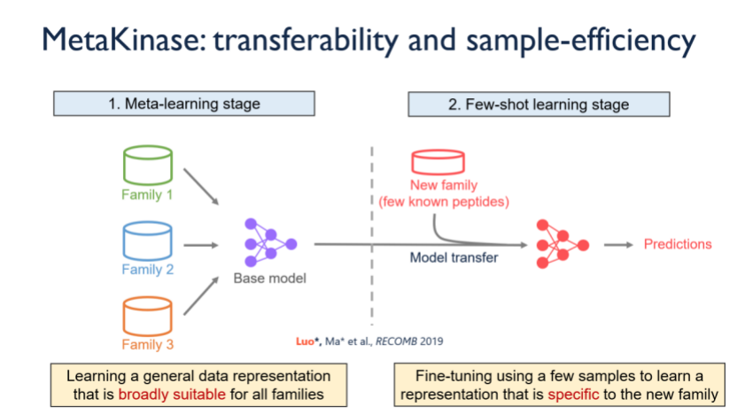 对于蛋白质功能预测问题,马教授提出了一种基于元学习的蛋白质功能预测方法。其中这种蛋白有很多族,每一族内的蛋白比较相似。现有的方法有两类,一种对每一族蛋白分别进行建模,一种把所有组都合在一起建模。前一种方法的问题是部分族的有标签数据很少,后一种方法会丢失族群间的区别。这在机器学习中是一种标准的多任务问题,这些任务间有关联性,又不太一样。利用元学习的思想,将每族的蛋白与短肽的结合作为一个任务,先对各任务做元学习模型,得到对不同族的蛋白非常敏感的表示,再将这一模型迁移到有标签数据很少的任务上。这项工作“Mitigating Data Scarcity in Protein Binding Prediction Using Meta-Learning”发表在RECOMB上。