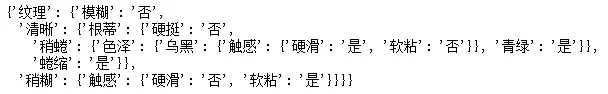 最后训练得到的决策树长这样,这是一个嵌套格式的字典,每个子字典代表了一个分支
