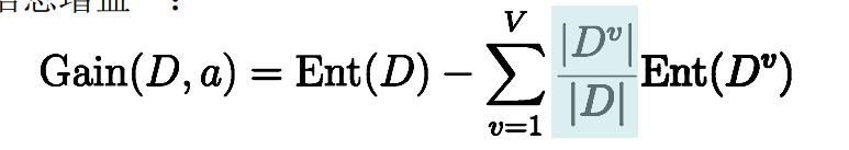 离散性a有v个可能的取值a1,a2……,aV,用a划分,则会产生n个分支节点,其中第n个分支节点包含了D中所有属性在a上取值为aV的样本,记为DV,则可计算出用属性a对样本集D进行划分所得到的信息增益: