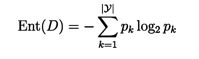 信息熵是度量样本集合纯度最常用的指标,假定当前集合D中第k类样本所占比例为pk(k=1,2,……,|y|) ,则D信息熵的定义为