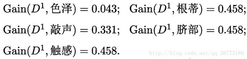 比如;D1{纹理=清晰}={1,2,3,4,5,6,8,10,15},第一个分支结点可用属性集合为{色泽、根蒂、敲声、脐部、触感},则基于集合D1计算出的各属性信息增益分别如下;