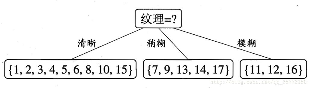 我们依据结点标签(清晰、稍糊、模糊)划分了三个子结点对应的集合。这里的3个子集合相当于一个类似总集合D一样的地位。重复上面找的纹理结点的方法进行递归。利用信息增益最大的方法来进行特征选择。