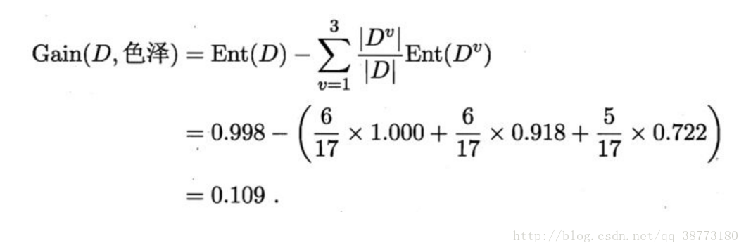由此我们可以计算出色泽属性的信息增益是: