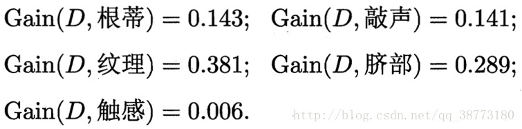 同理,按照一样的方法我们可以求出其他属性的信息增益,分别如下: