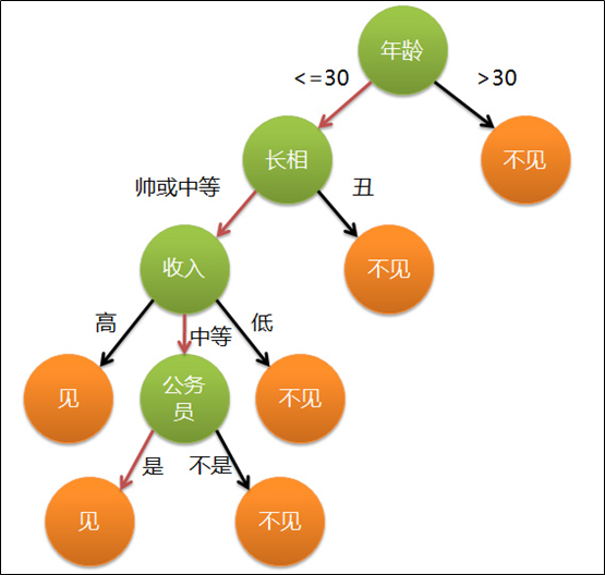 图中红色箭头表示了上面例子中女孩的决策过程。这幅图基本可以算是一颗决策树,说它”基本可以算“是因为图中的判定条件没有量化,如收入高中低等等,还不能算是严格意义上的决策树,如果将所有条件量化,则就变成真正的决策树了。