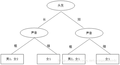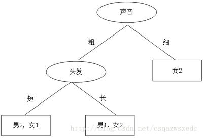 ② 先根据声音判断,然后再根据头发来判断,决策树如下:
