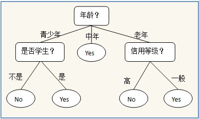 上表是一个预测一个人是否会购买购买电脑的决策树,利用这棵树,我们可以对新记录进行分类,从根节点(年龄)开始,如果某个人的年龄为中年,我们就直接判断这个人会买电脑,如果是青少年,则需要进一步判断是否是学生;如果是老年则需要进一步判断其信用等级,直到叶子结点可以判定记录的类别。