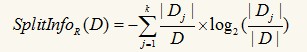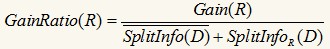 我们找GainRatio最大的属性作为最佳分裂属性。如果一个属性的取值很多,那么SplitInfoR(D)会大,从而使GainRatio(R)变小。不过增益比率也有缺点,SplitInfo(D)可能取0,此时没有计算意义;且当SplitInfo(D)趋向于0时,GainRatio(R)的值变得不可信,改进的措施就是在分母加一个平滑,这里加一个所有分裂信息的平均值: