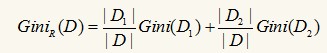 D1为D的一个非空真子集,D2为D1在D的补集,即D1+D2=D,对于属性R来说,有多个真子集,即GiniR(D)有多个值,但我们选取最小的那么值作为R的基尼指数。最后: