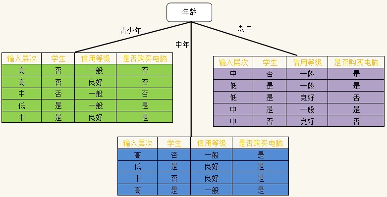 | 记录ID | 年龄 | 输入层次 | 学生 | 信用等级 | 是否购买电脑 |