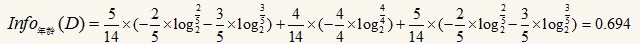 这个数据集是根据一个人的年龄、收入、是否学生以及信用等级来确定他是否会购买电脑,即最后一列“是否购买电脑”是类标。现在我们用信息增益选出最最佳的分类属性,计算按年龄分裂后的信息量: