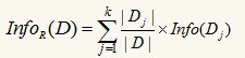 有了上面关于熵的简单理解,我们接着讲信息增益。假设我们选择属性R作为分裂属性,数据集D中,R有k个不同的取值{V1,V2,...,Vk},于是可将D根据R的值分成k组{D1,D2,...,Dk},按R进行分裂后,将数据集D不同的类分开还需要的信息量为: