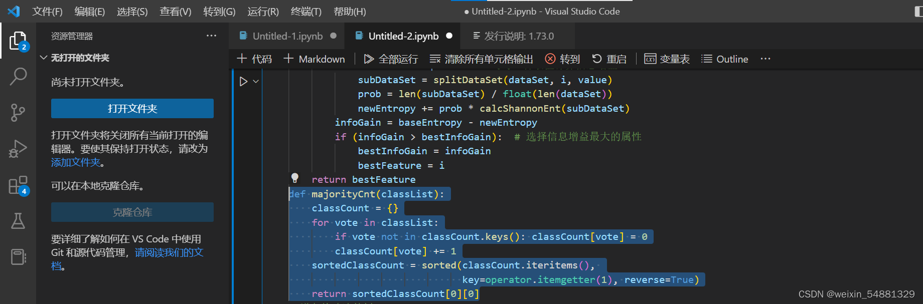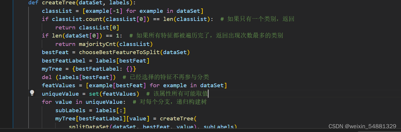 用两个if判断,如果都是属于同一类别的,则直接将该类作为该树枝里的样本所代表的类。如果用于划分的特征都用完了,就直接把该类中数量最多的类别返回。如果没有用完特征并且树枝里有许多别的类别,就继续处理:构建一个树,采用最好的划分特征进行划分。删除该特征的列,然后对每个分支进行递归构建决策树。