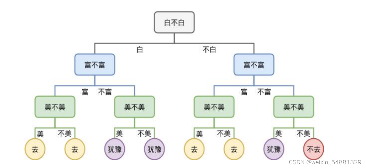 例如下图一个例子,现想象一个男孩的母亲要给这个男孩介绍女朋友,决策树用树结构实现上述的判断流程如下图。