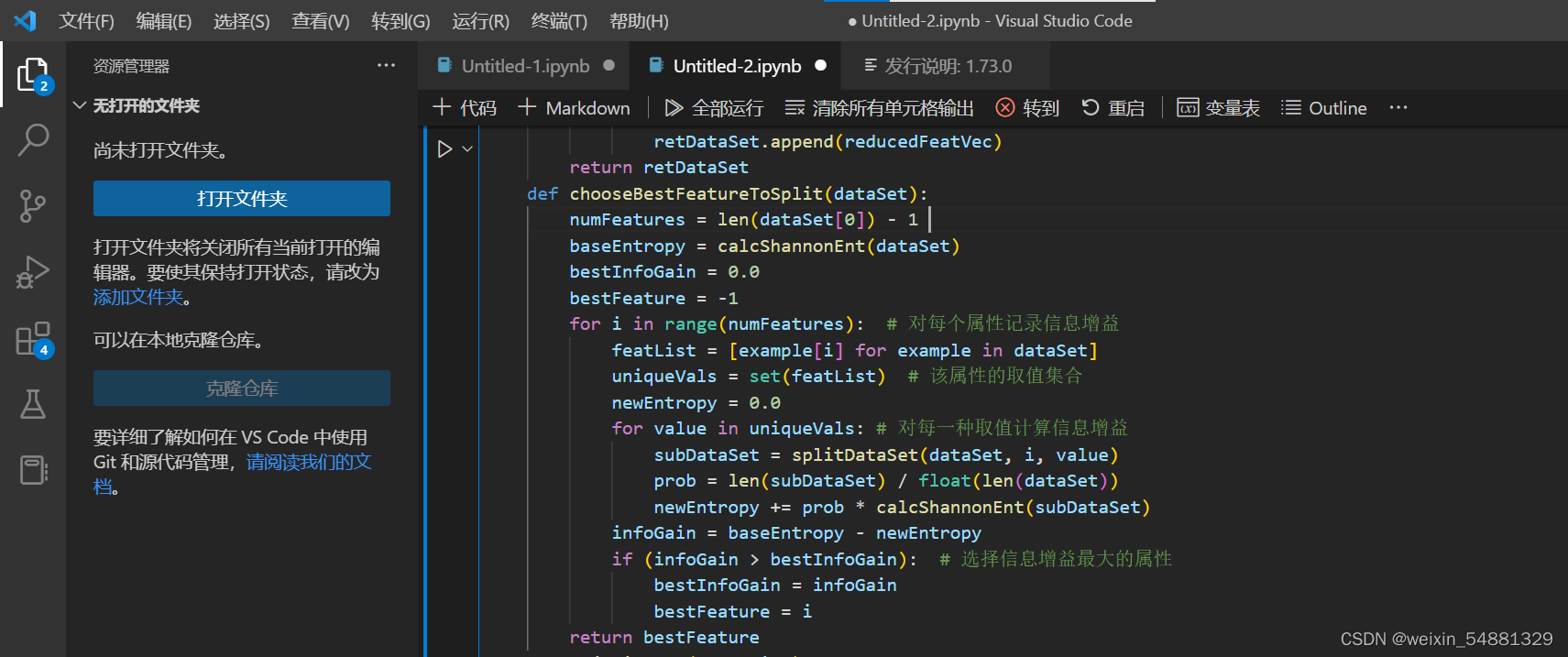 4:选择最好的数据集进行划分:dataSet[0]代表第一个样本,即[1, 1, 'yes'],长度为3, 3-1=2,表示该样本的特征数。然后计算出香农熵。