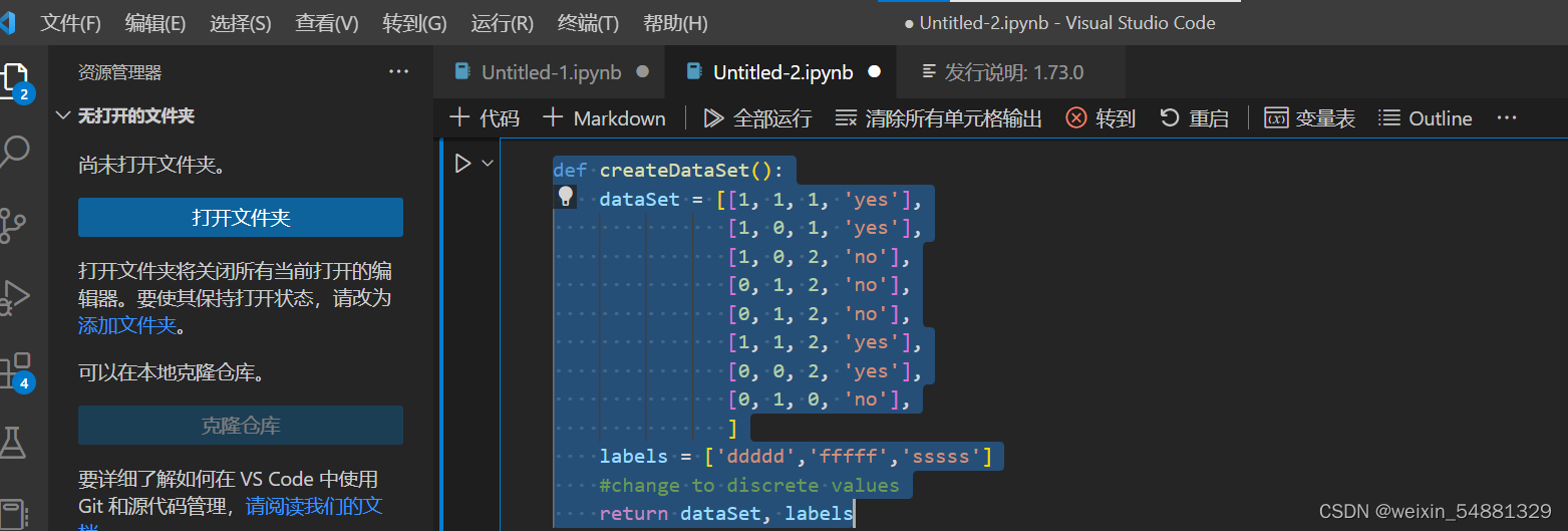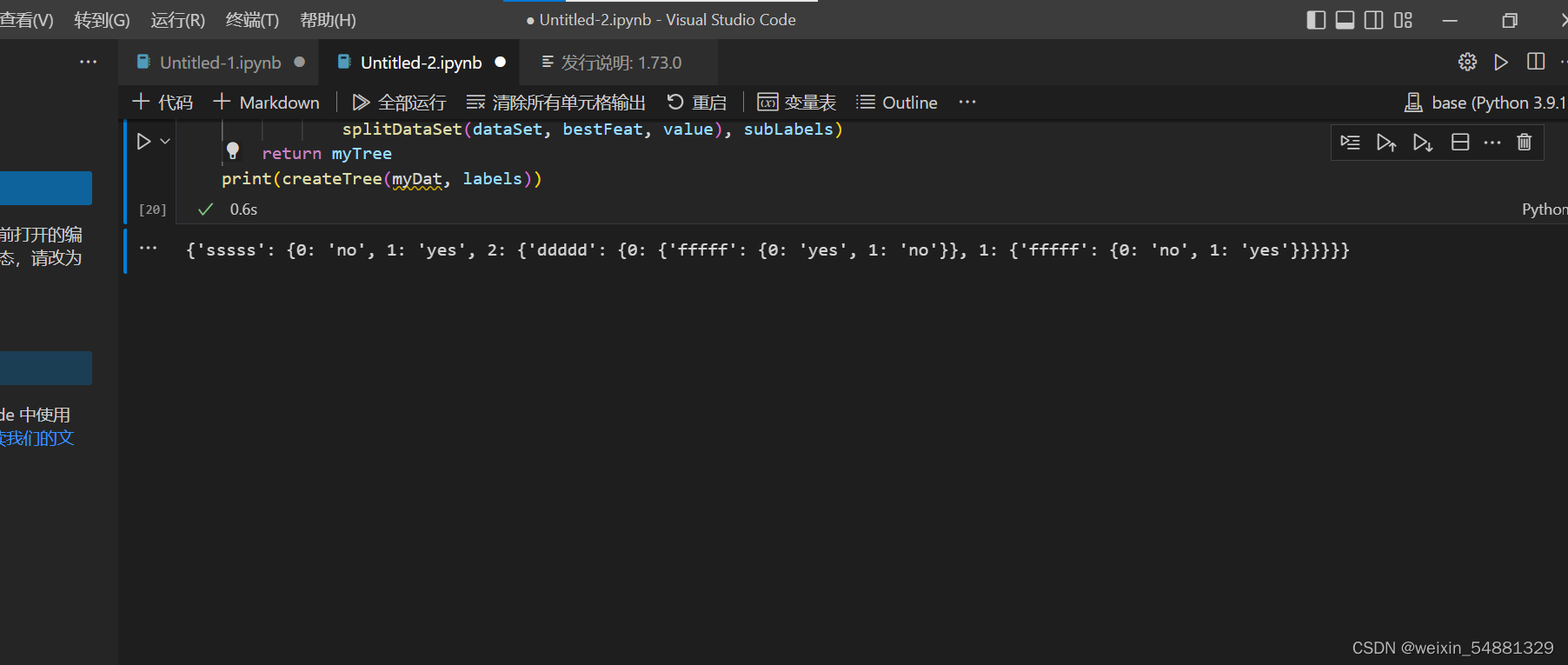 7:最后 print(createTree(myDat, labels)) 测试结果