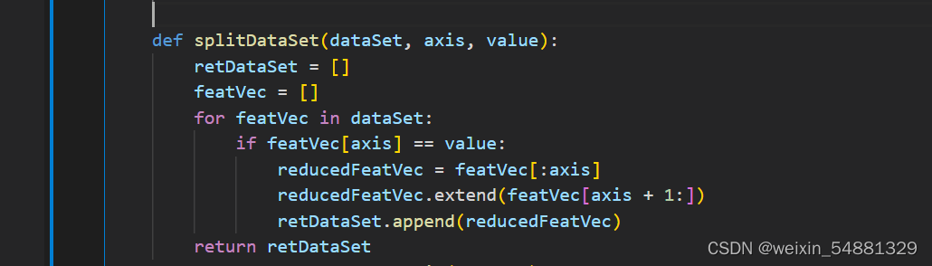 3: 划分子数据集:axis:按第几个属性划分,value:要返回的子集对应的属性值