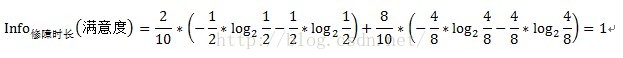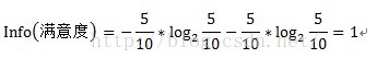 其中D为目标变量,此例中为满意度。m=2,即满意和不满意两种情况。Pi为满意度中属于分别属于满意和不满意的概率。此例中共计10条数据,满意5条,不满意5条。概率都为1/2。Info(满意度)即为仅仅基于满意和满意的类别比例进行划分所需要的信息需求,计算方式为: