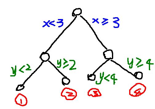 随机森林由决策树组成,决策树实际上是将空间用超平面进行划分的一种方法,每次分割的时候,都将当前的空间一分为二,如说下面的决策树,其属性的值都是连续的实数,如图1所示。将空间划分为成的样子如图2所示(注:所使用图片来自于网络)。