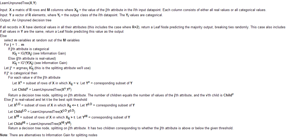 第二、当每个样本有M个属性时,在决策树的每个节点需要分裂时,随机从这M个属性中选取出m个属性,满足条件m << M。然后从这m个属性中采用某种策略(比如说信息增益)来选择1个属性作为该节点的分裂属性。