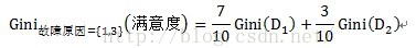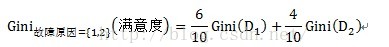 计算子集故障原因={1,3}的子集的Gini指标时,D1和D2分别为故障原因={1,3}的元组共计7条数据,故障原因不属于{1,3}的元组即故障原因为2的数据,共计3条数据。详细计算过程如下:
