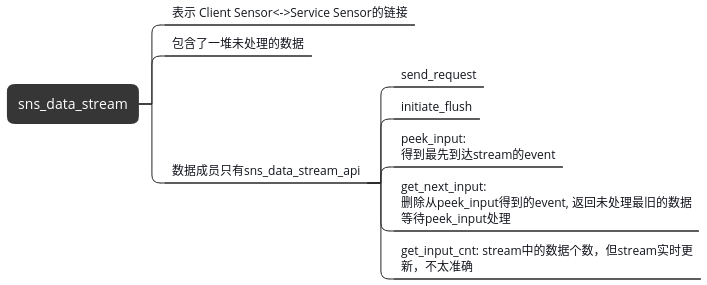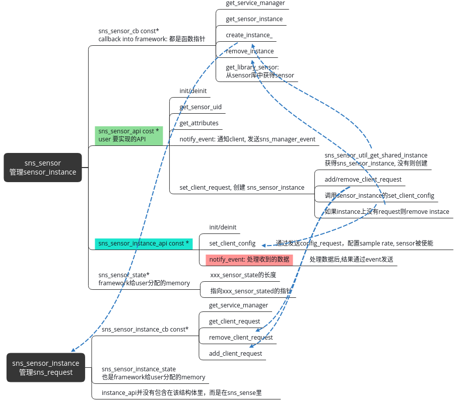 数据结构sensor instance 管理sns_request , 使用sensor instance callback (framework实现)调入到 sensor framework 去add/remove/get client request等;