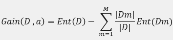 了解了信息熵之后我们就得考虑如何生成最佳的决策树,因为对于同样的训练集我们可以生成很多个决策树都适用于这个训练集,而现在我们只去考虑最优的那一棵树,对于其他的我在之后随机森林的文章里会讲到。那么最优的那棵树肯定是在每一个内部节点上都会减少最多的信息熵来让剩下的子集更好分类,也就是会去最大化父节点与其下子节点之间的信息熵的差值,我们会称之为最大化信息增益。而对于离散特征a可能会有M种不同的取值,即a1,a2,a3...am,而如果我们使用特征a对数据集D分类会产生M个分支节点,而Dm就是在数据集D种所有在特征a取值am的样本合集,也就是第M个分支,计算信息增益的公式为