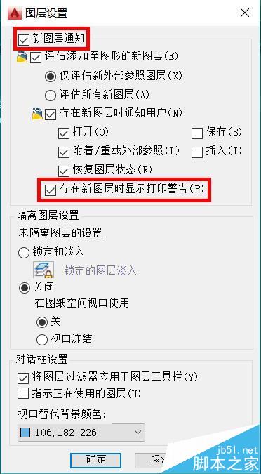 3、在弹出的“图层设置”对话框中,取消选中“存在新图层时显示打印警告”。或者直接取消选中“新图层通知”。这样可以一劳永逸的解决“协调新图层”问题。
