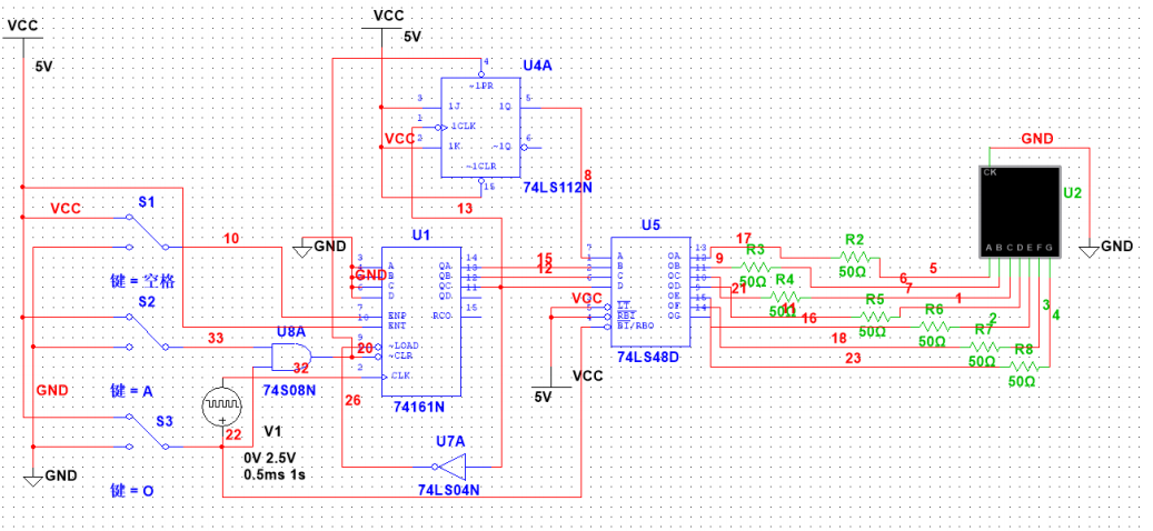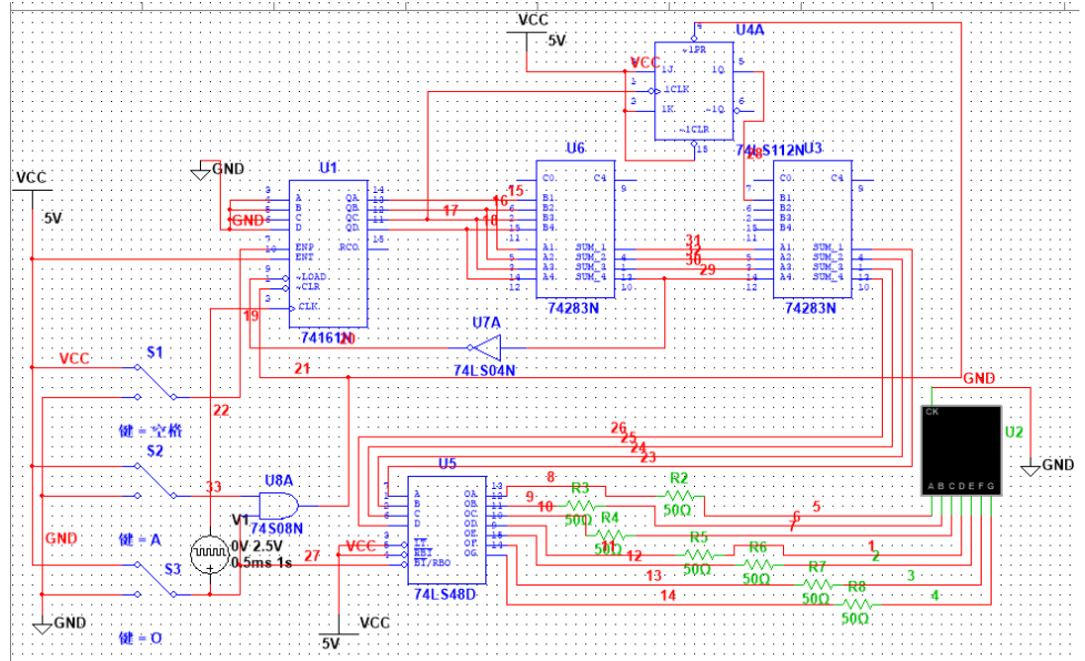 (5)暂停键(空格)是利用74161N的ENP端,当低电平时,计数保持。