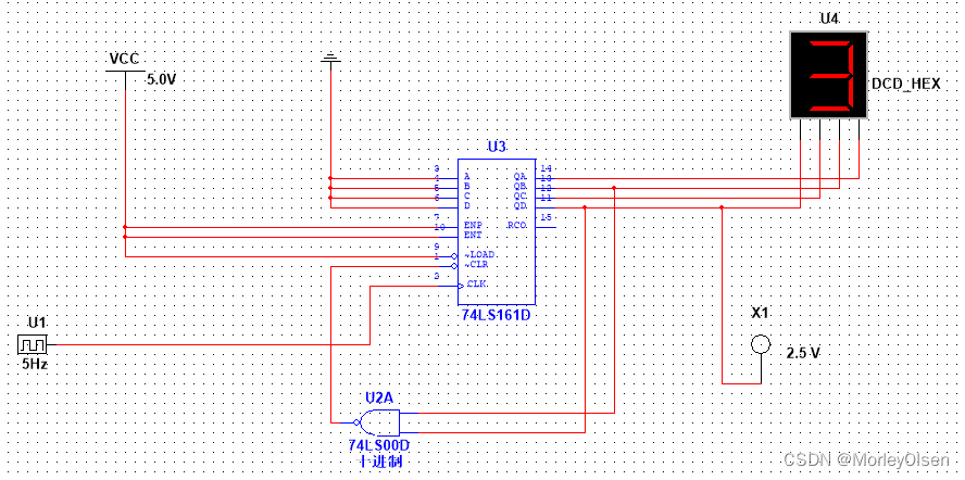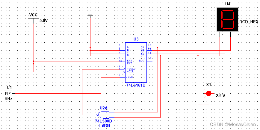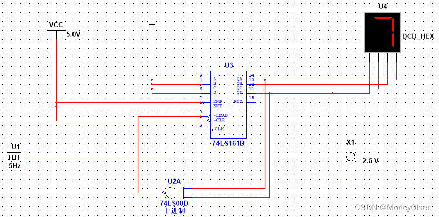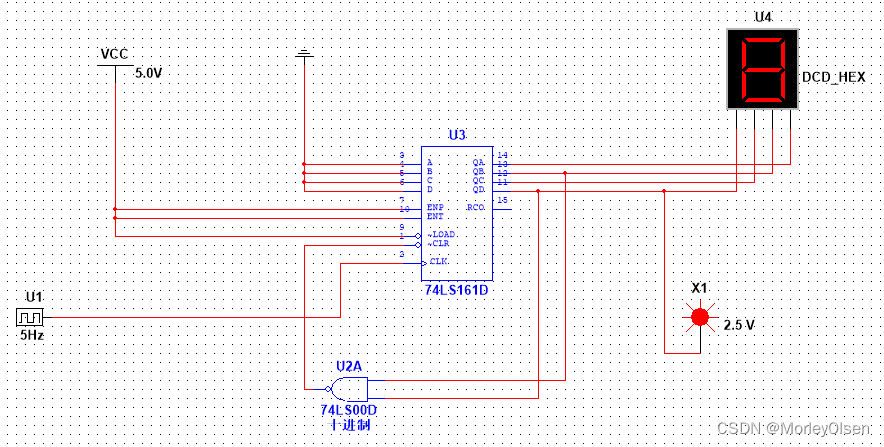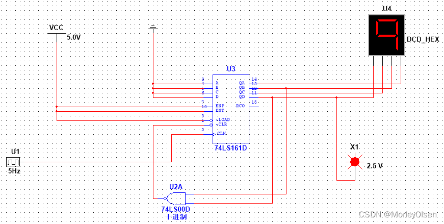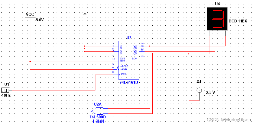用中规模集成计数器74HC161和与非门74LS00,构成十进制计数器。要求分别使用同步预置、异步清零两种功能来设计。用数码管显示。
