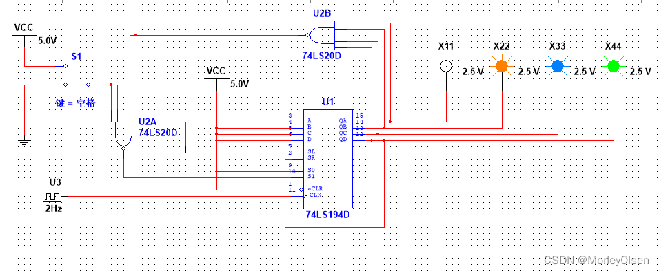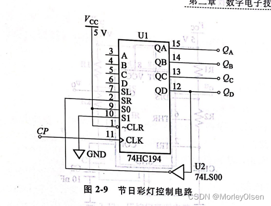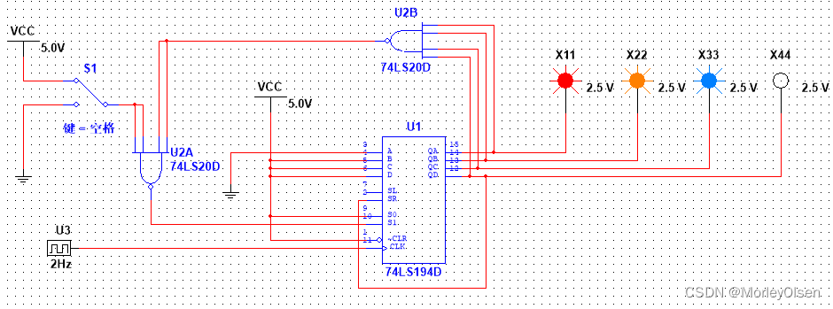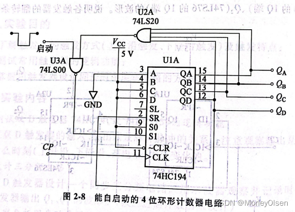 用4位双向移位寄存器74HC194,设计一个能够自启动的4位环形计数器,并测试其输入CP和输出QA、QB、QC、QD的逻辑关系。