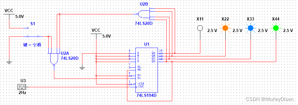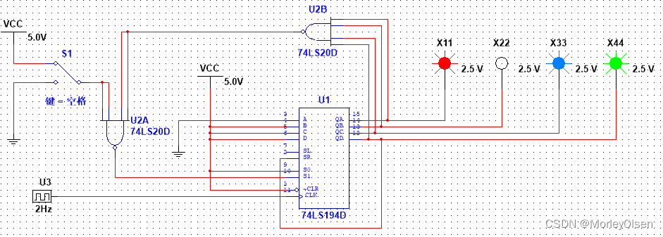 在软件中连接成以上电路图后,点击运行即可开始仿真。下面将依次展示每个步骤过程及电路对应的输出状态。