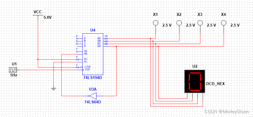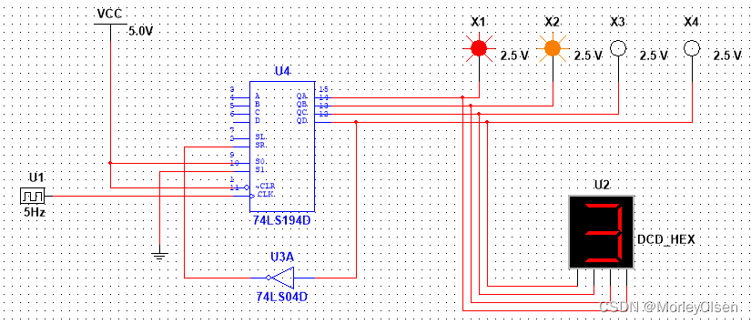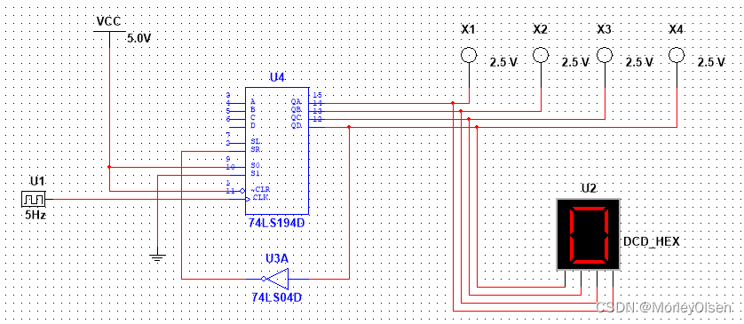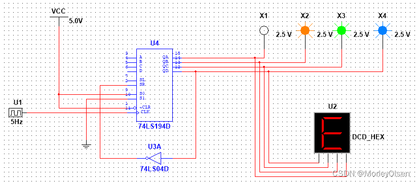 根据模拟仿真实验的运行过程中可知,当CP每输入一个上升沿信号时,双向移位寄存器执行一次右移功能,使得Q端的各位输出均右移一位,并把末位的数字移到首位中,即实现一次环形计数功能。