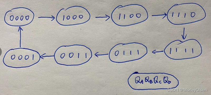 根据模拟仿真实验的运行过程中可知,Q端输出信号依次对应为0000->1000->1100->1110->1111->0111->0011->0001->0000。通过上述变化过程可以得到状态转换图如下图所示。由于输出即为Q端信号,因此不在状态转换图中展示输出变化。