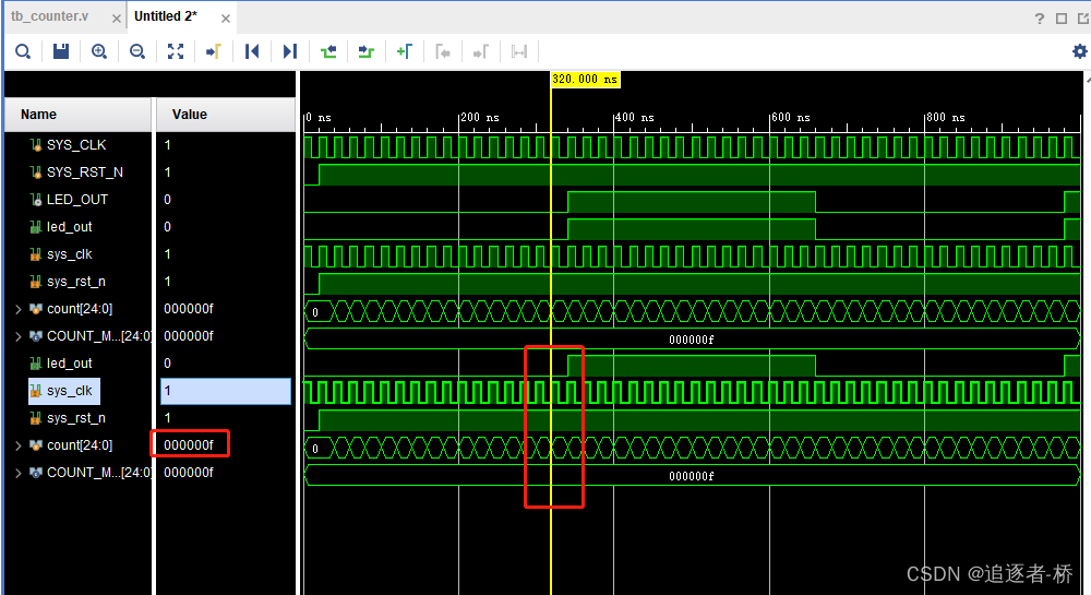 对比上面波形图,虽然源代码是0.5s变换一次电平,但是由于仿真代码中设置的最大计数是15,因此再15后,计数器下一个状态变为0,同时改变输出电平。