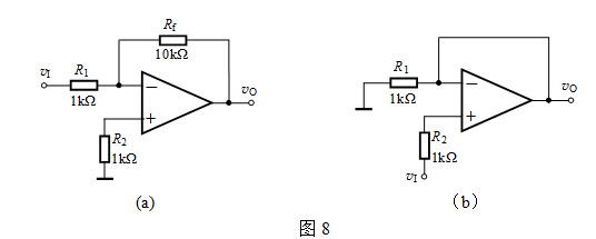 6、【单选题】电路如图8所示,假设运算放大器是理想的,则图(a)Av = vO/vI = ,Ri = ;图(b)Av = vO/vI = ,Ri = 。